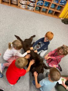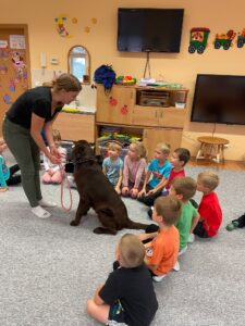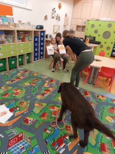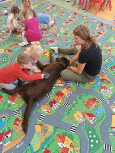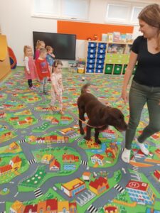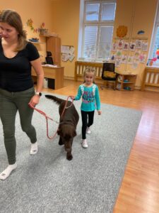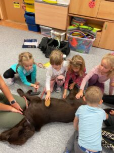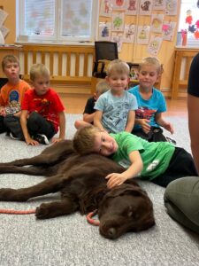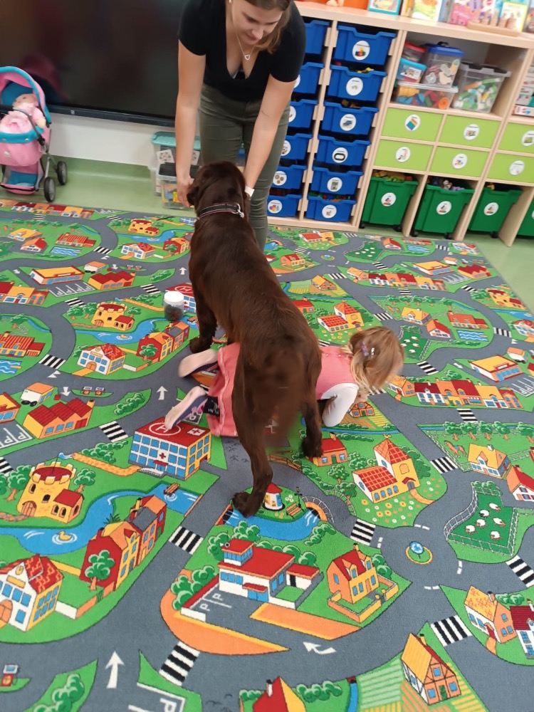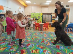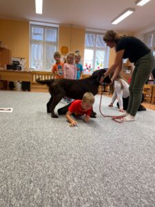 Ve středu 1.10.2025 se děti zúčastnily canisterapie. Navštívila nás paní Mužíková se svou čtyřnohou parťačkou Mimmi. Děti se naučily, jak se chovat k cizím pejskům, česaly, hladily a krmily fenku pamlsky, házely Mimmi aport a vodily ji na vodítku. Všechny děti dostaly na památku pamětní list s fotkou fenky Mimmi.